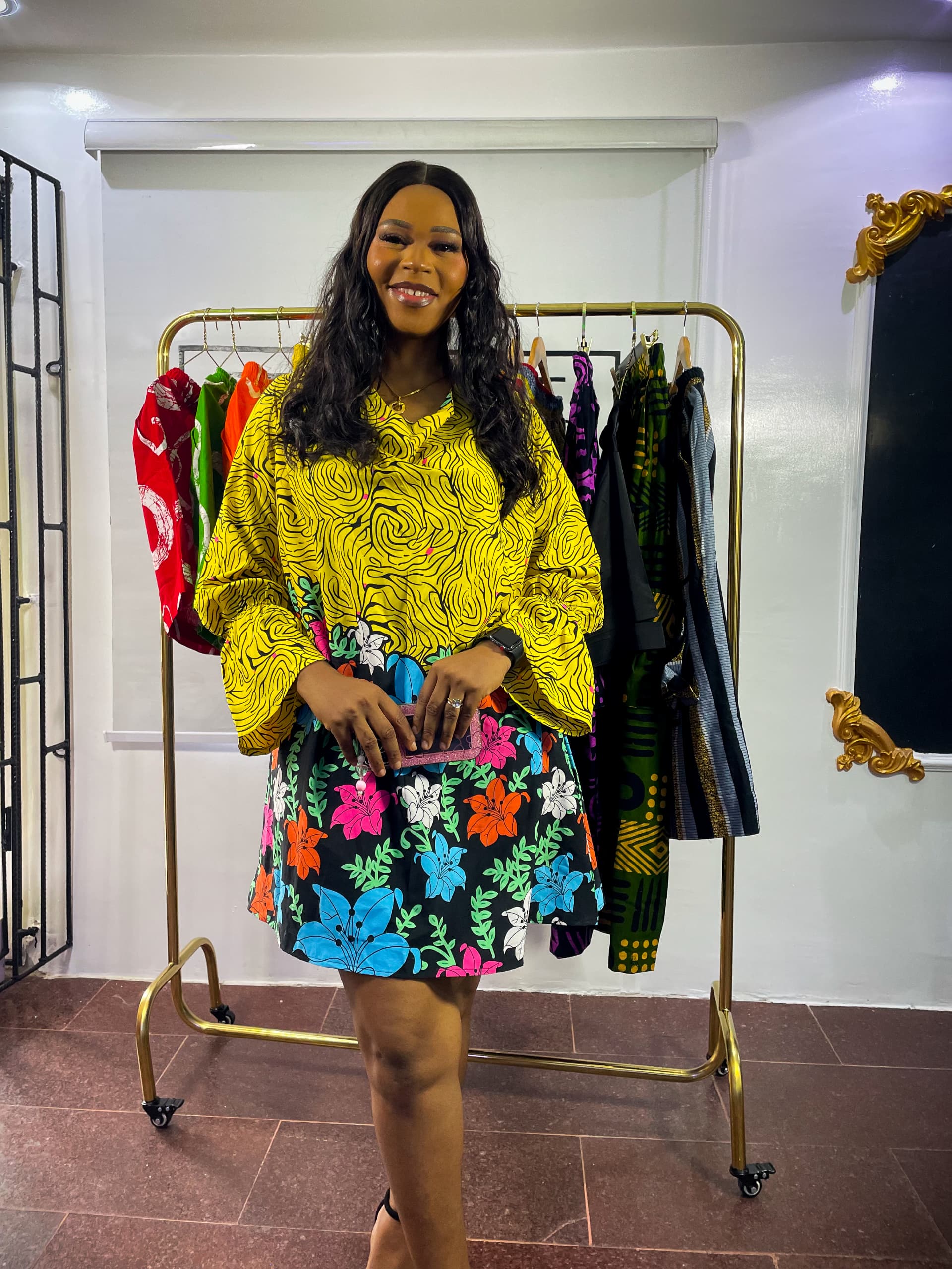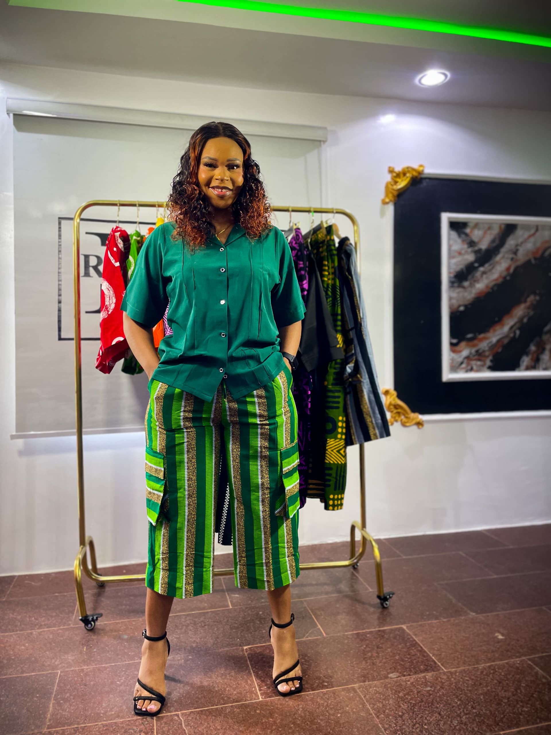 2)Two piece Ankara set paired with tailored three-quarter combat shorts,blending vibrant African print with a modern,edgy silhouette.